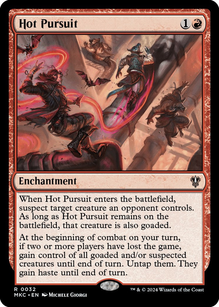 Rules Text Contains: When Hot Pursuit enters the battlefield, suspect target creature an opponent controls. As long as Hot Pursuit remains on the battlefield, that creature is also goaded.